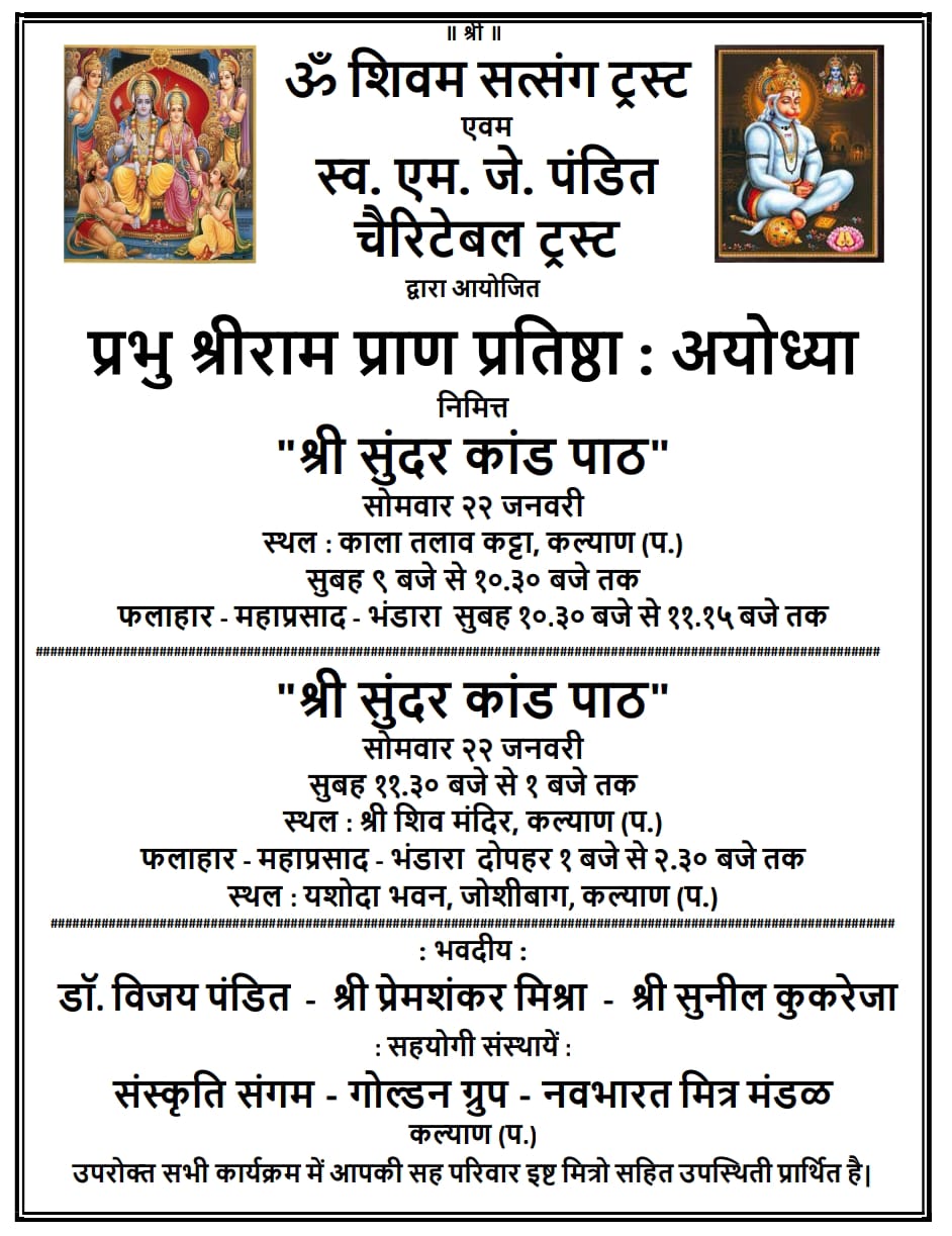 ‘ॐ शिवम सत्संग ट्रस्ट’ – ‘स्व.एम.जे.पंडित ट्रस्ट’ द्वारा आयोजित ‘श्रीराम मंदिर प्राण प्रतिष्ठा समारोह’ – अयोध्या’ निमित्त ‘श्री सुंदरकांड पाठ’ और फलाहार – महाप्रसाद – भंडारा का आयोजन – सोमवार 22 जनवरी को काला तलाव कट्टा – कल्याण (पं.) पर और श्रीशिवमंदिर,नियर पुष्पराज होटल,कल्याण पर आयोजित किया गया है।